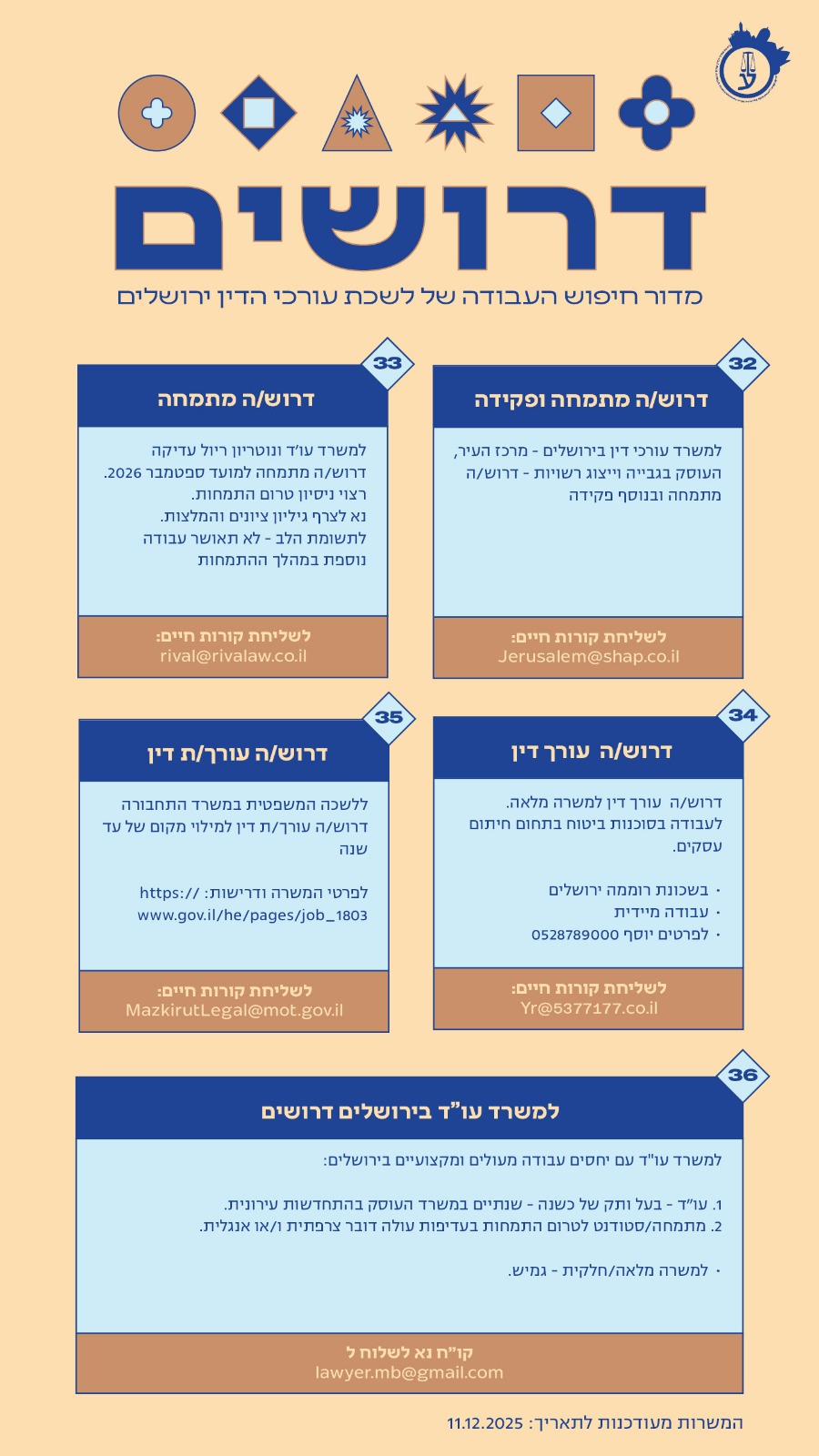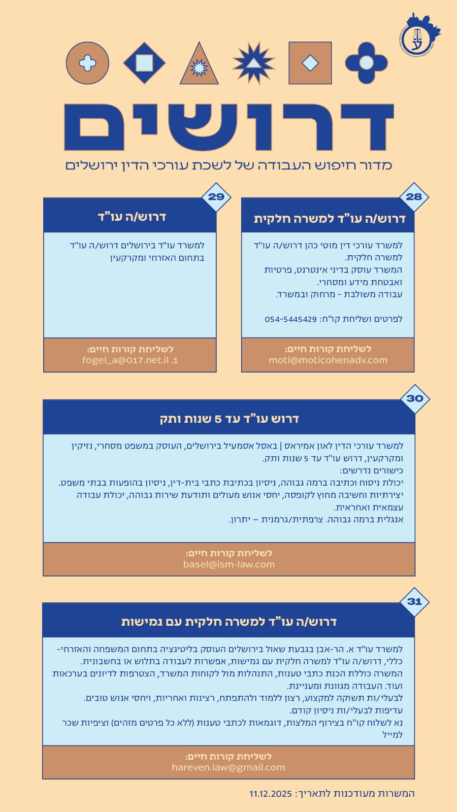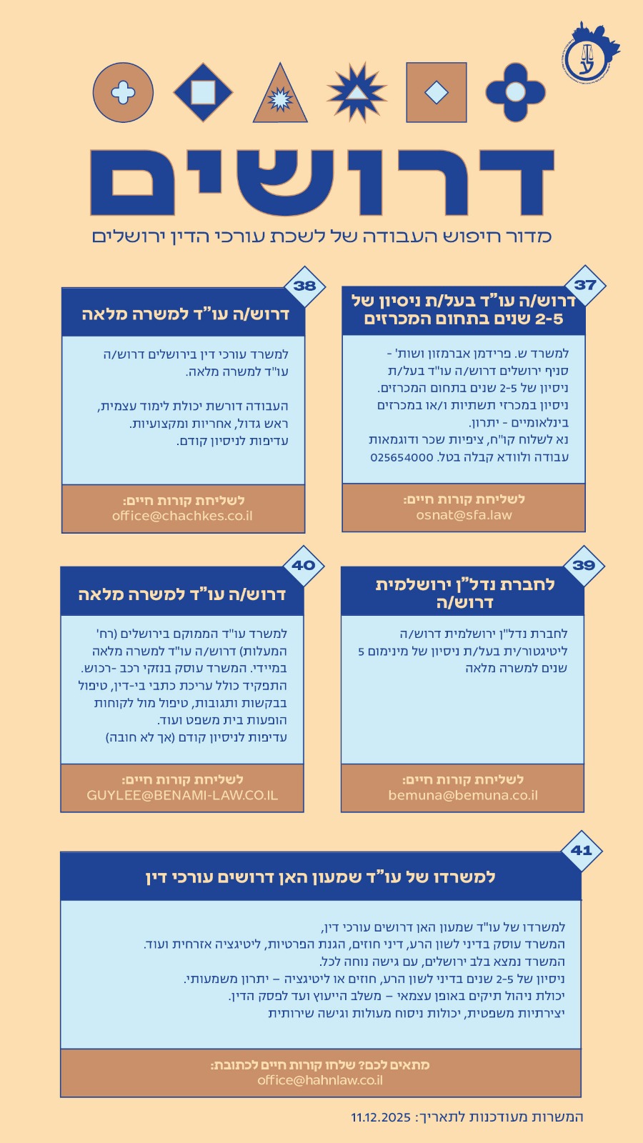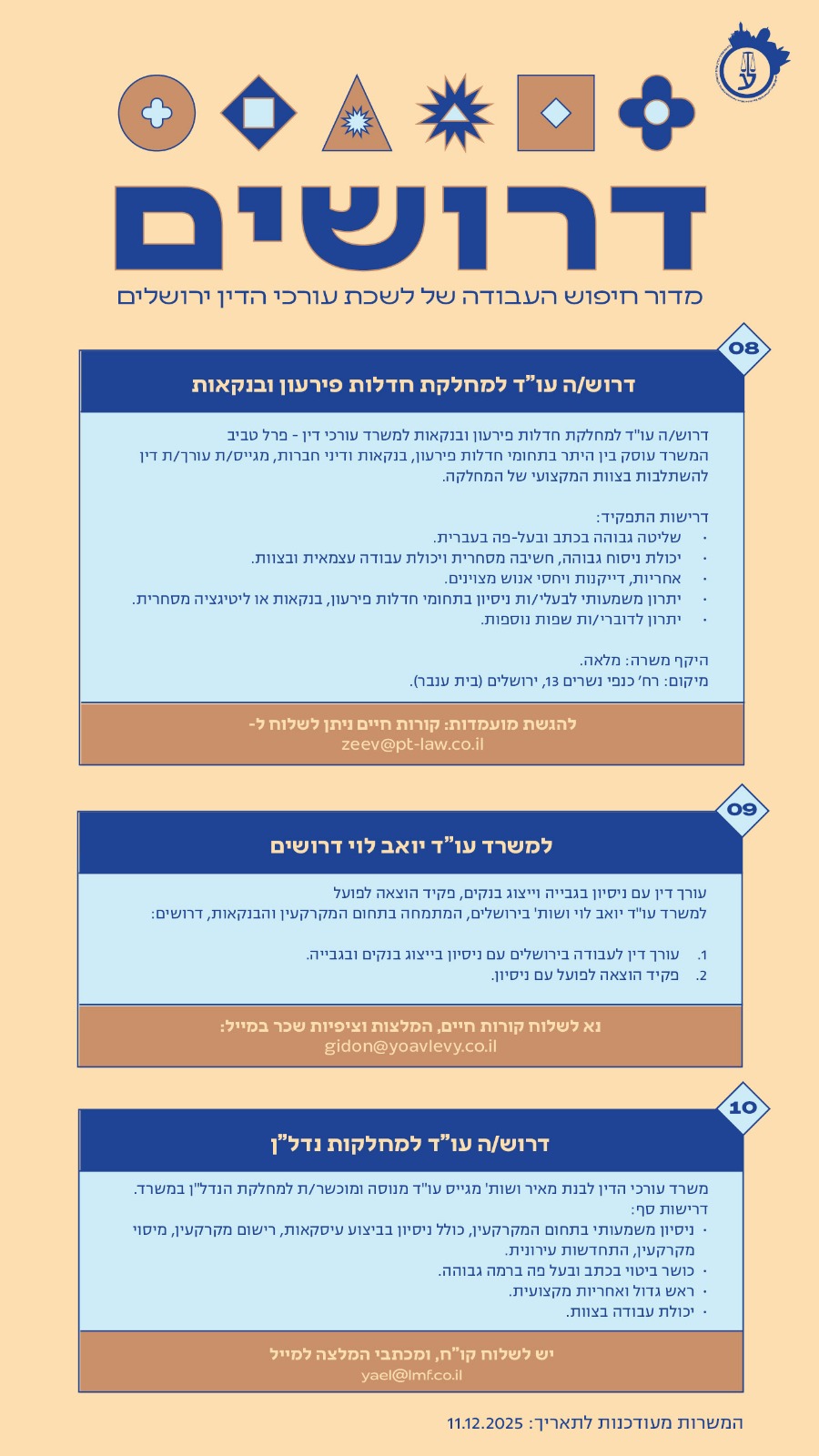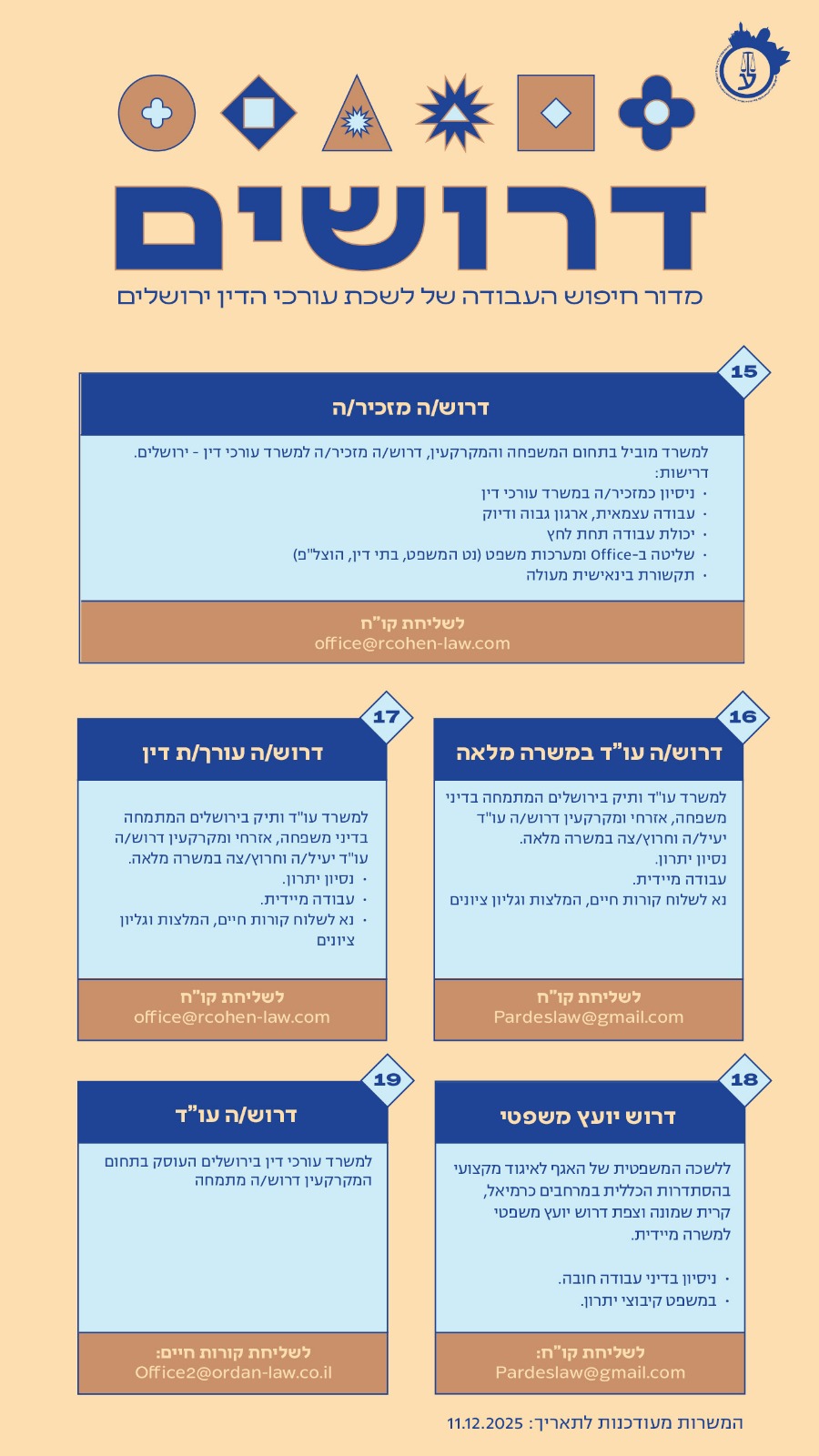 למשרד עורכי דין בירושלים דרוש עורך/ת דין למשרה מלאה בתחומים הבאים: