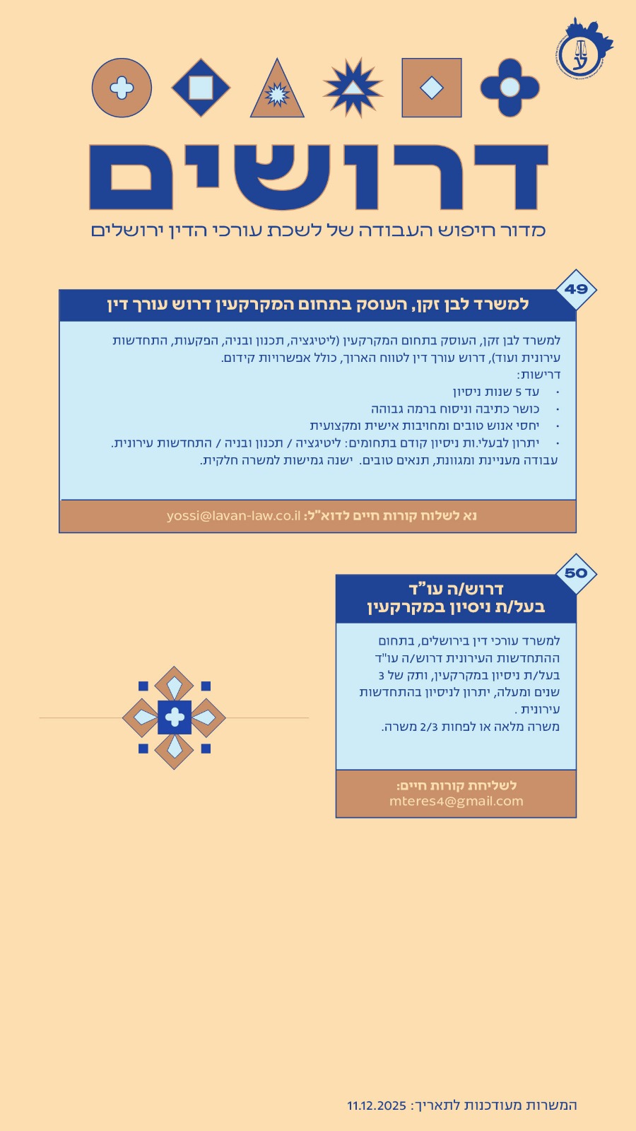 למשרד לבן זקן, העוסק בתחום המקרקעין (ליטיגציה, הפקעות, התחדשות עירונית ועוד), דרוש עו"ד לטווח הארוך, כולל אפשרות קידום.