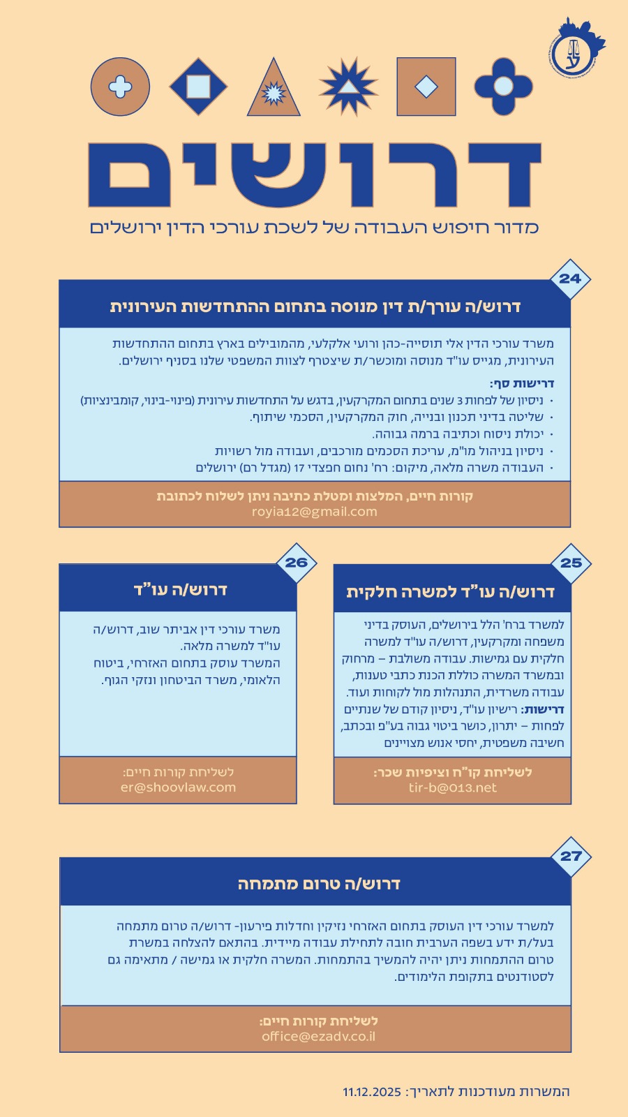 – יתרון לבעלי/ות ניסיון קודם בתחומים: ליטיגציה / תכנון ובניה / התחדשות עירונית