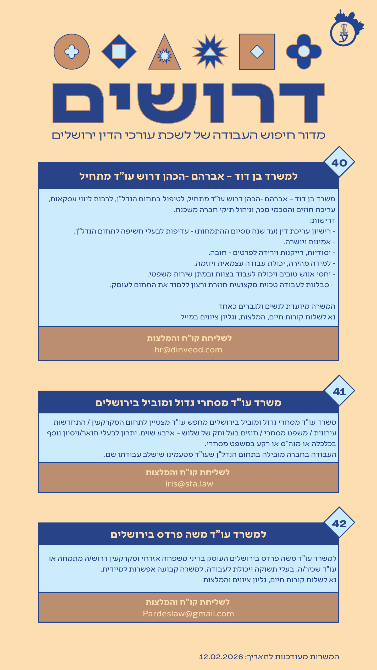 קורות חיים יש לשלוח לכתובת המייל: fundalaw@netvision.net.il