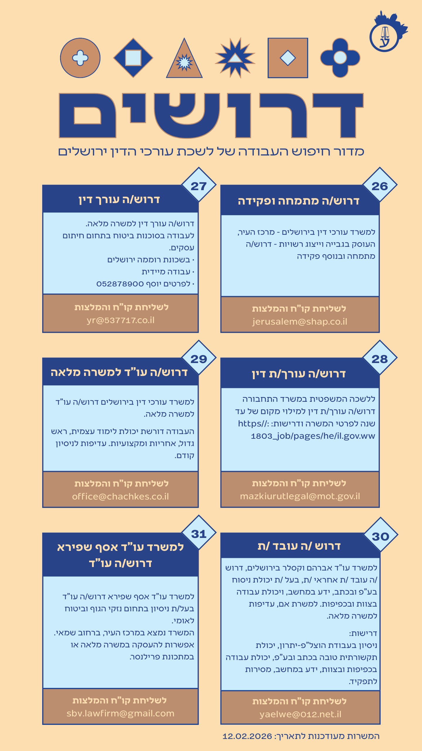 לקבלת פרטים אודות המשרה ולהגשת קורות חיים – ניתן לפנות בדוא"ל של גב' איקה בלחש- ממונה על פרויקטים ומינהל במינהל היועמ"ש לעירייה : blika@jerusalem.muni.il