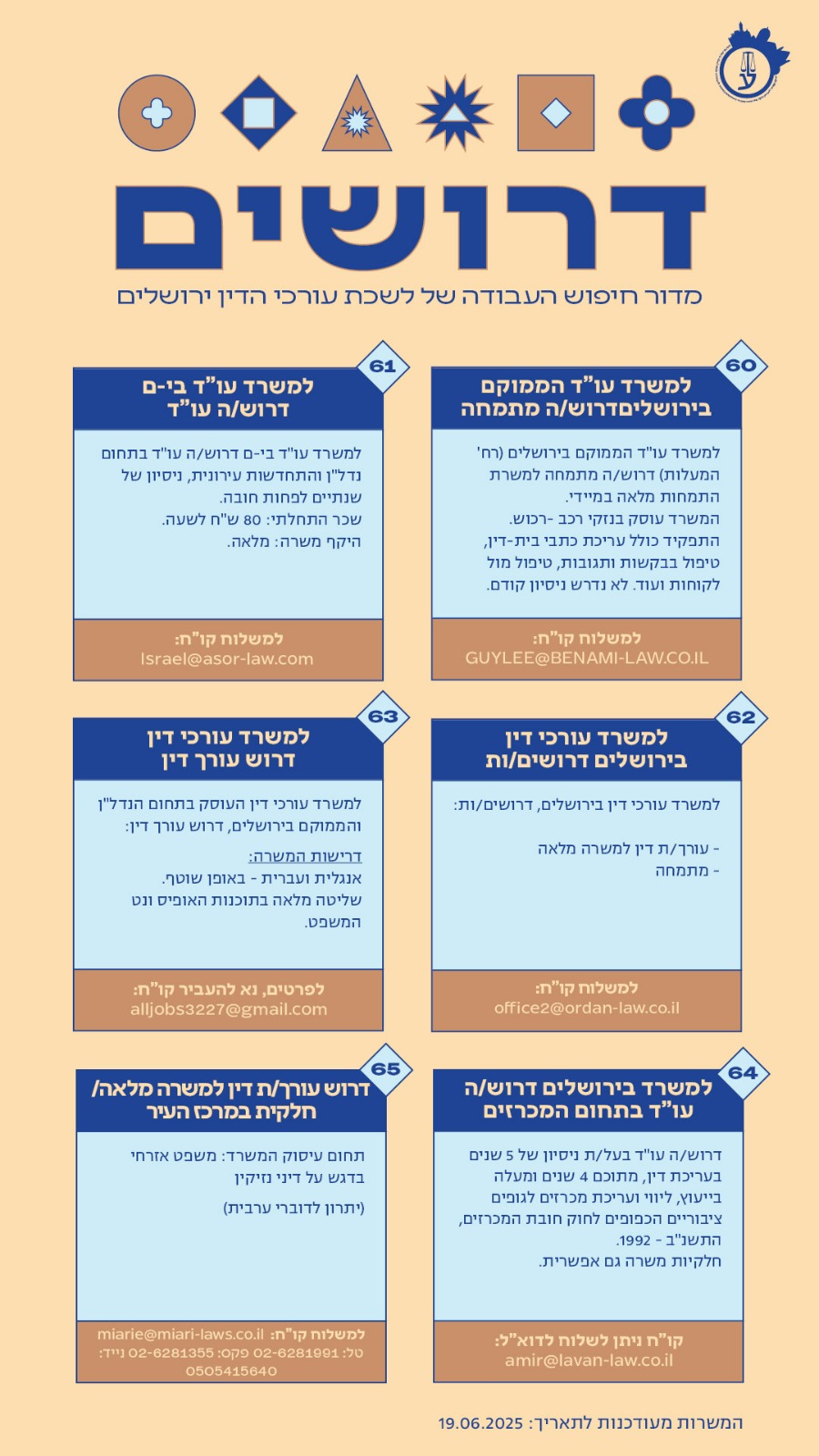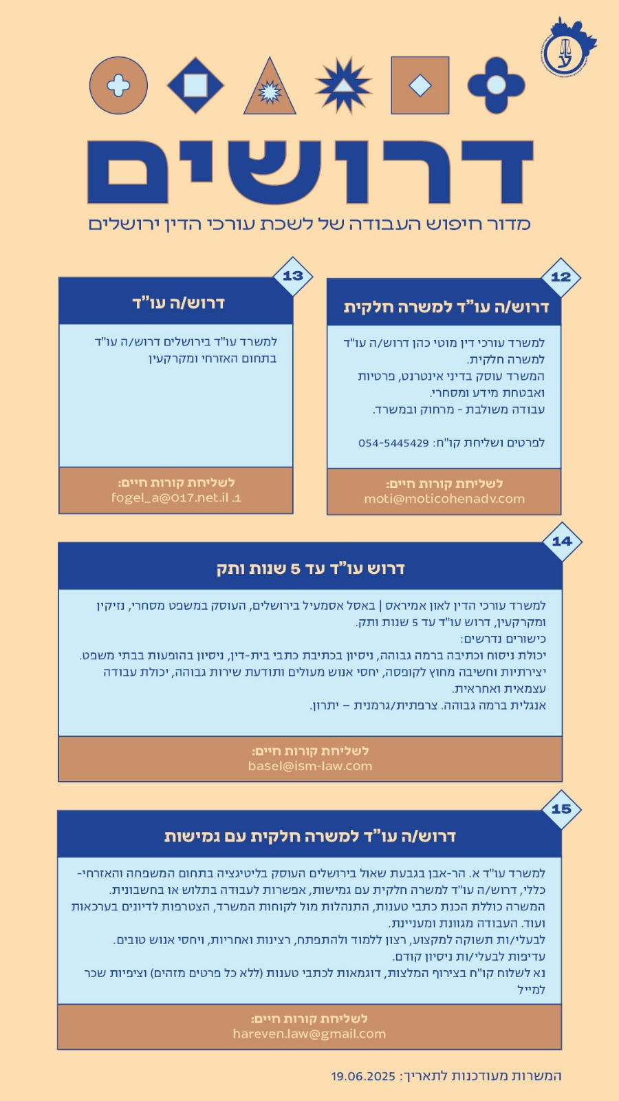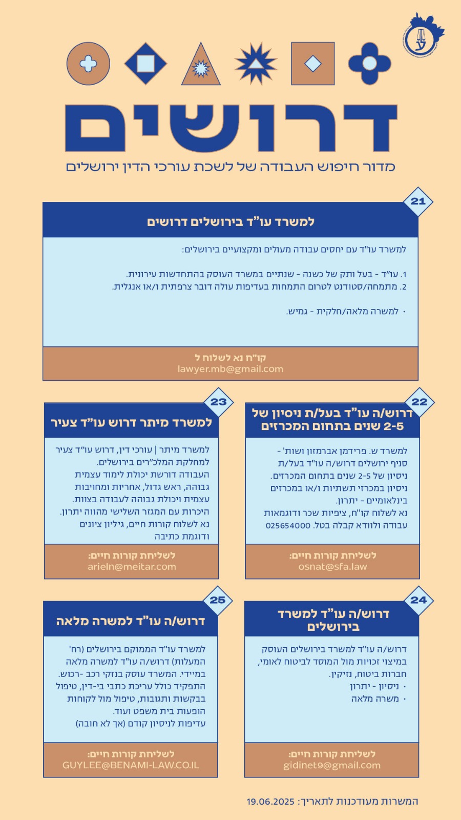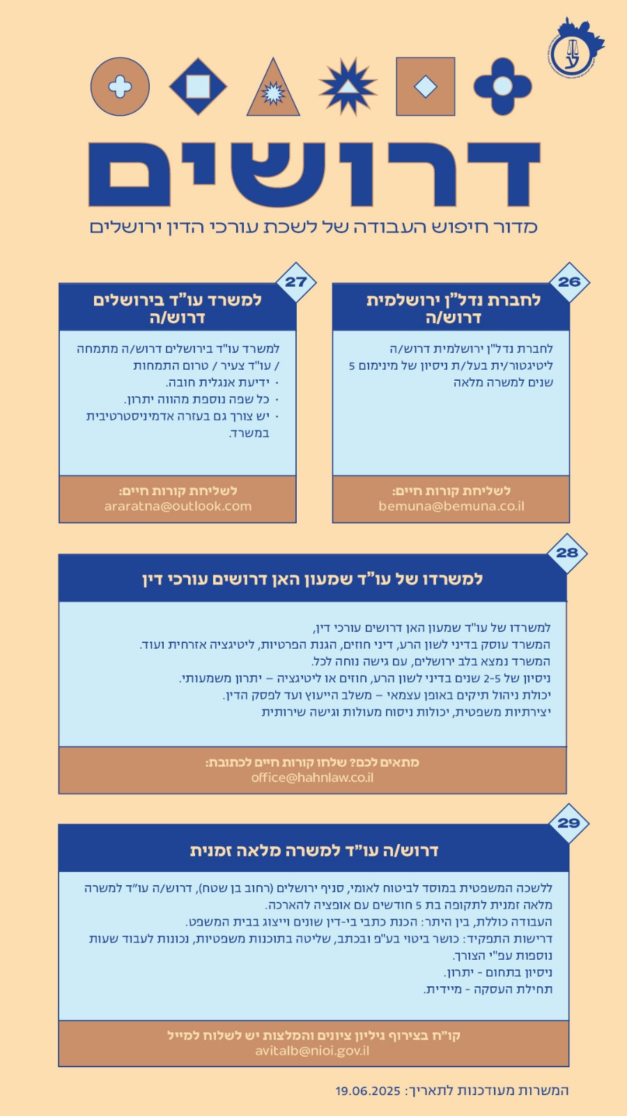 למשרד עורכי דין בירושלים דרוש עורך/ת דין למשרה מלאה בתחומים הבאים: