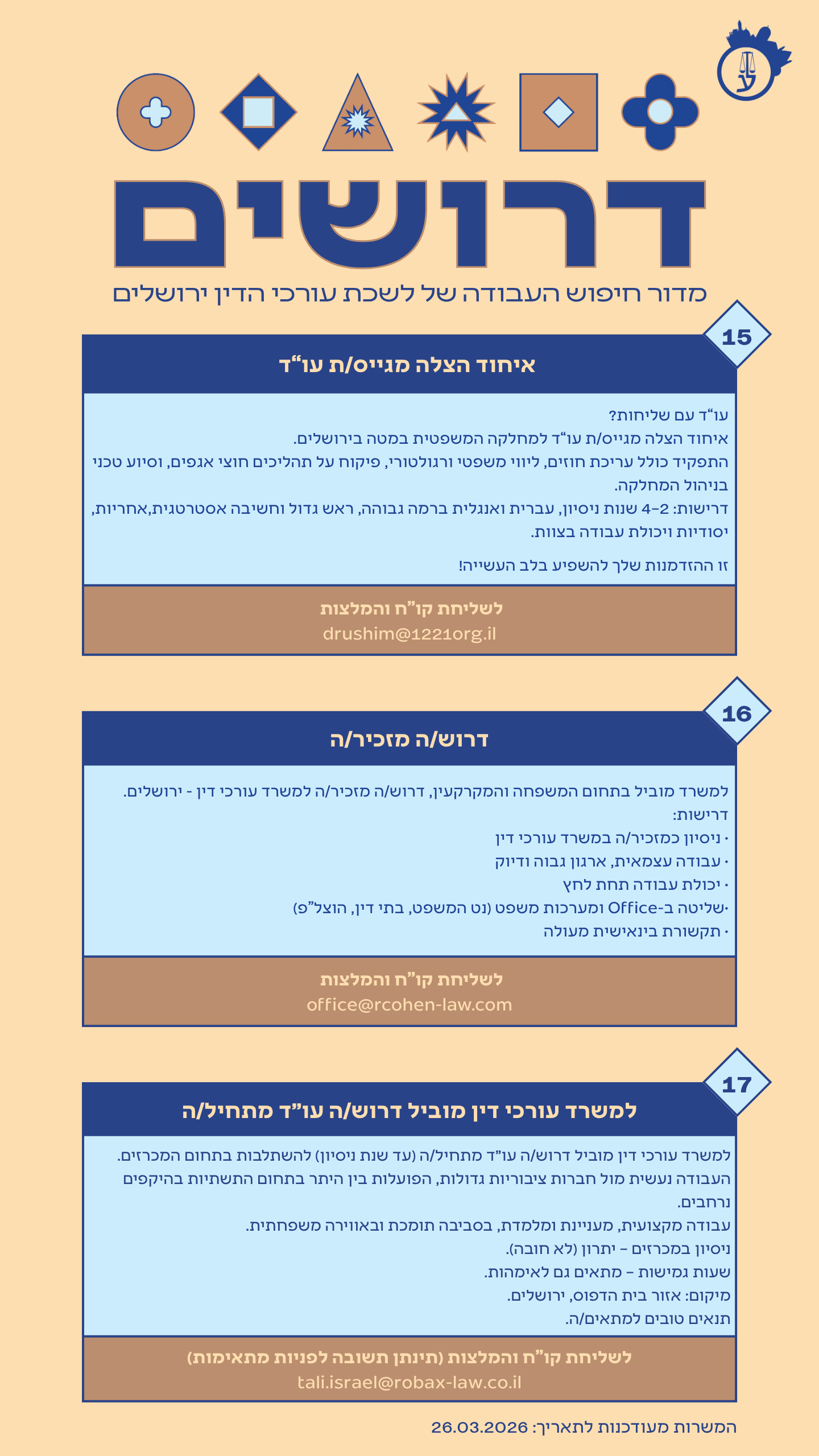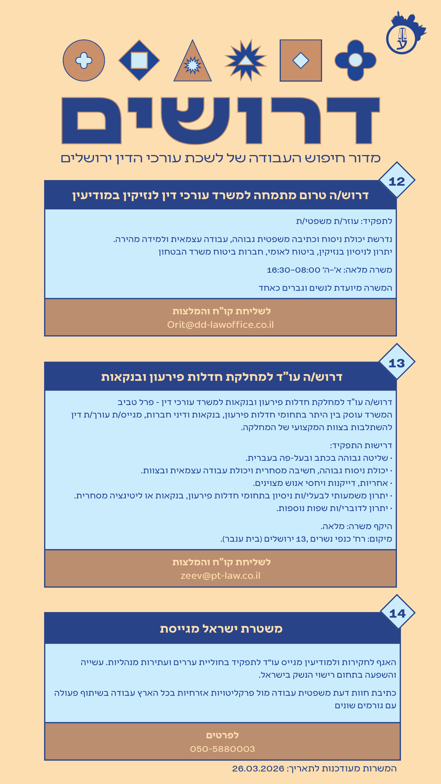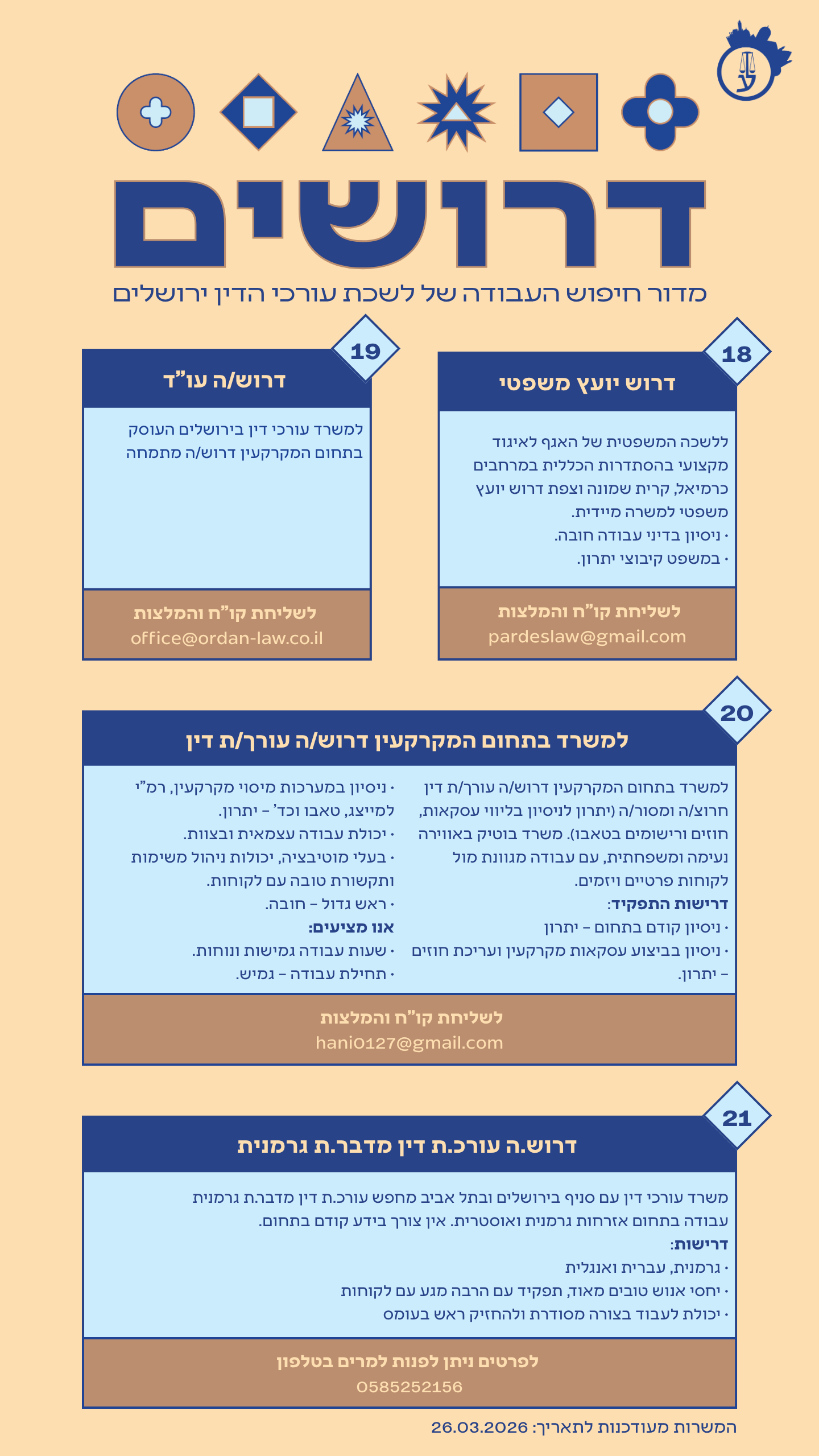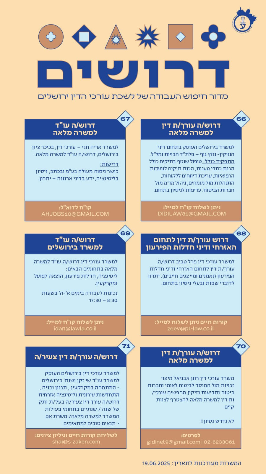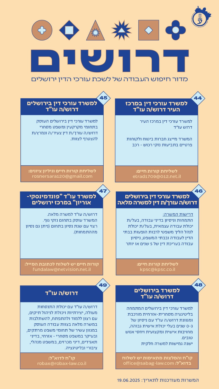 קורות חיים יש לשלוח לכתובת המייל: fundalaw@netvision.net.il