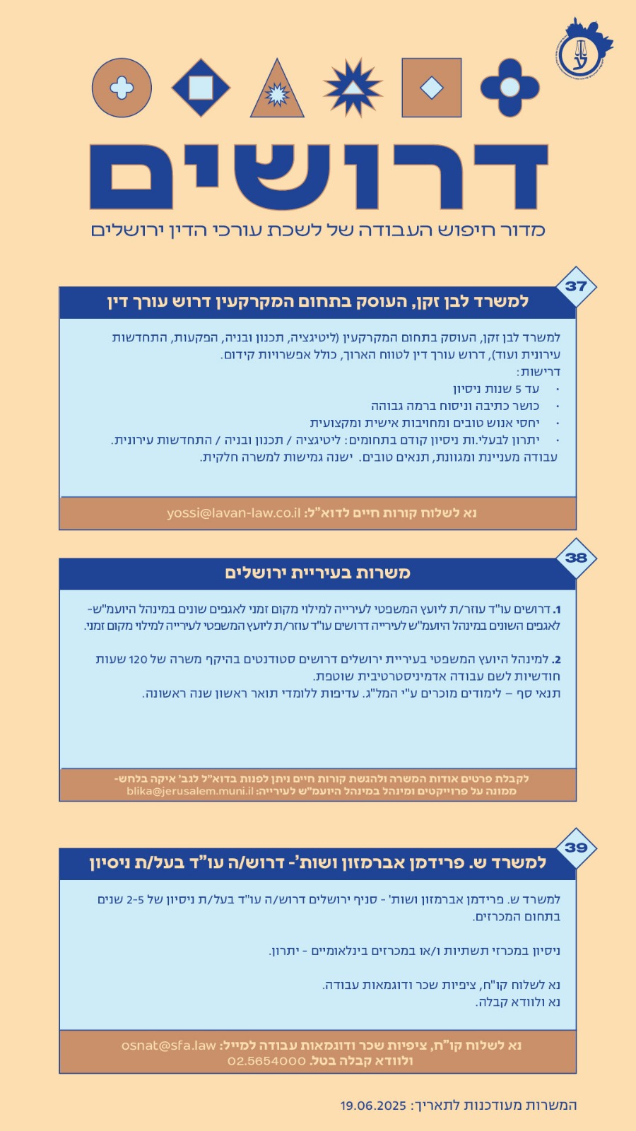 למשרד לבן זקן, העוסק בתחום המקרקעין (ליטיגציה, הפקעות, התחדשות עירונית ועוד), דרוש עו"ד לטווח הארוך, כולל אפשרות קידום.