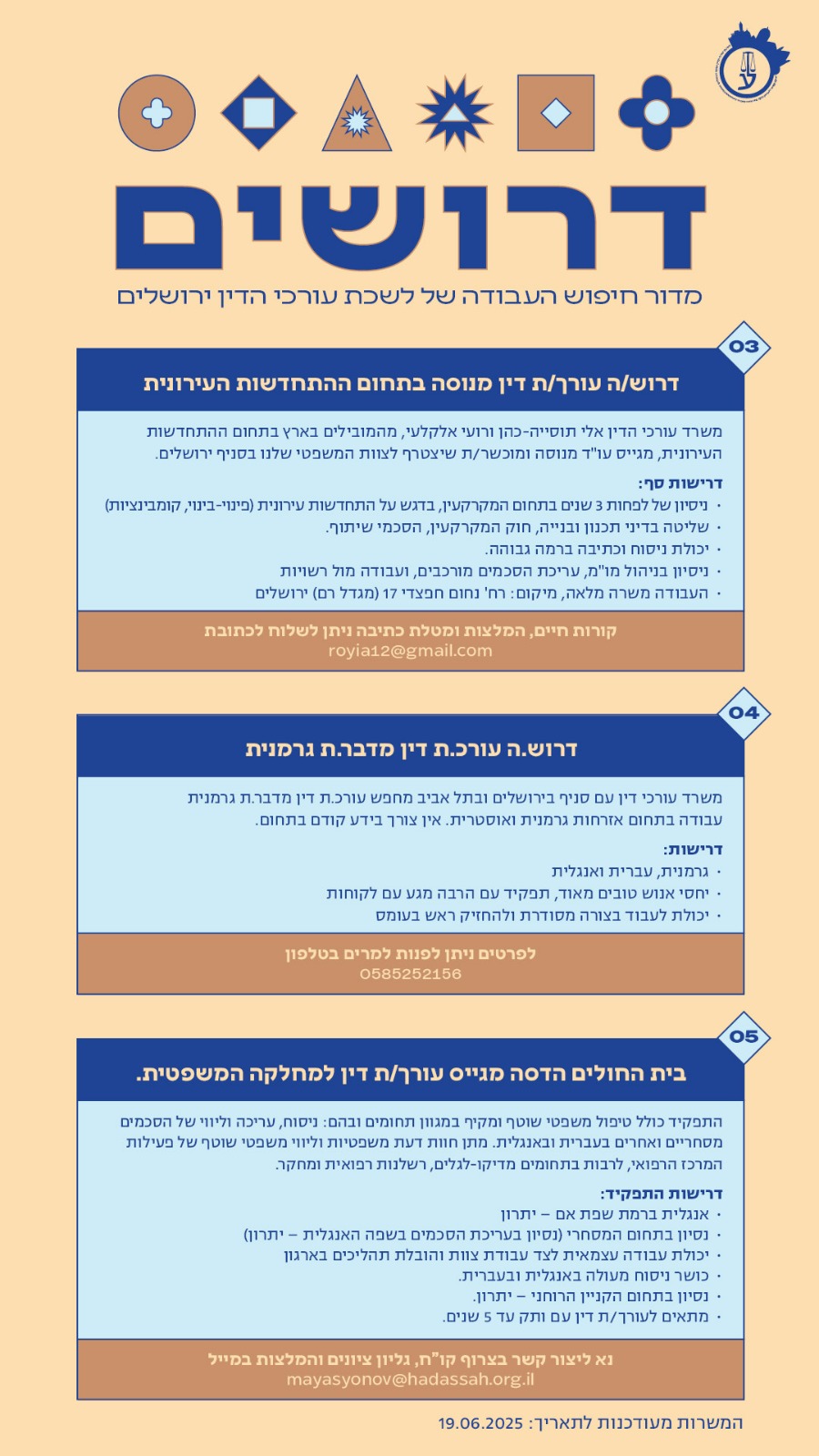 – יתרון לבעלי/ות ניסיון קודם בתחומים: ליטיגציה / תכנון ובניה / התחדשות עירונית