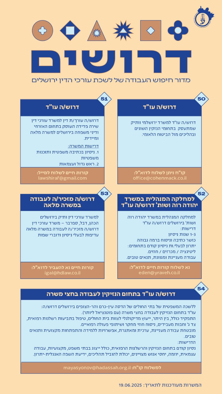 למשרד עורכי דין בירושלים דרוש עו"ד בתחום הביטוח והנזיקין.