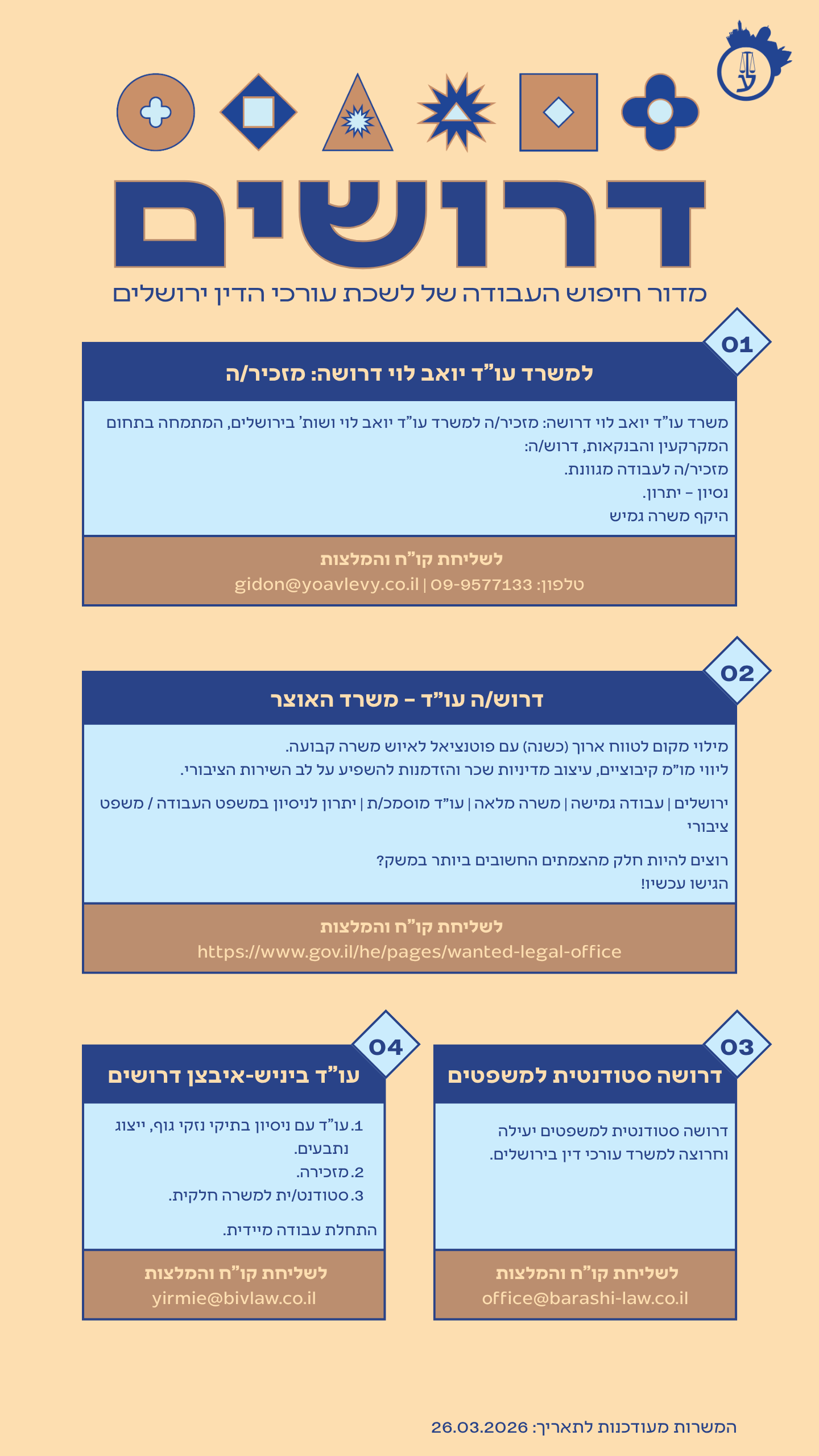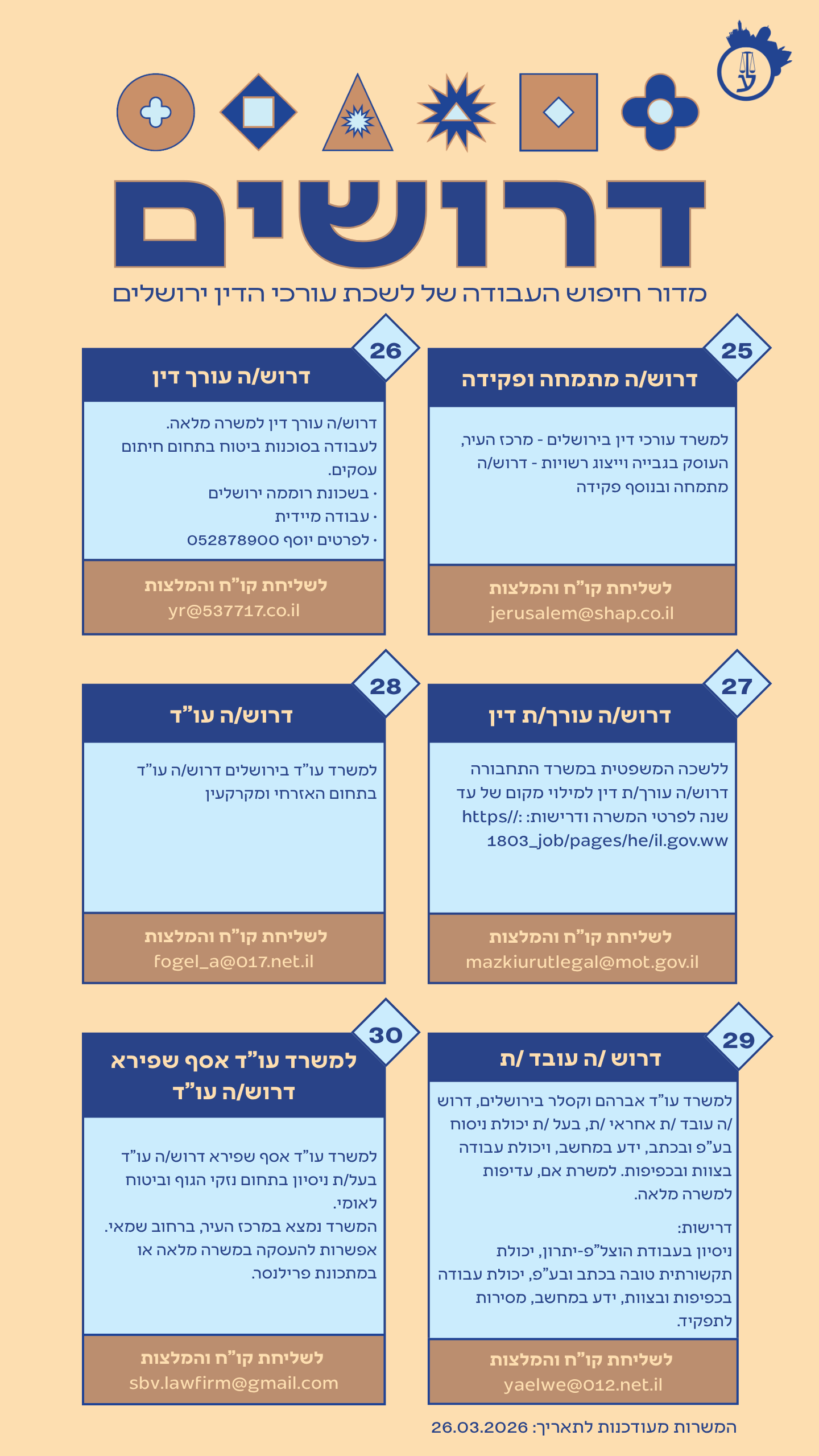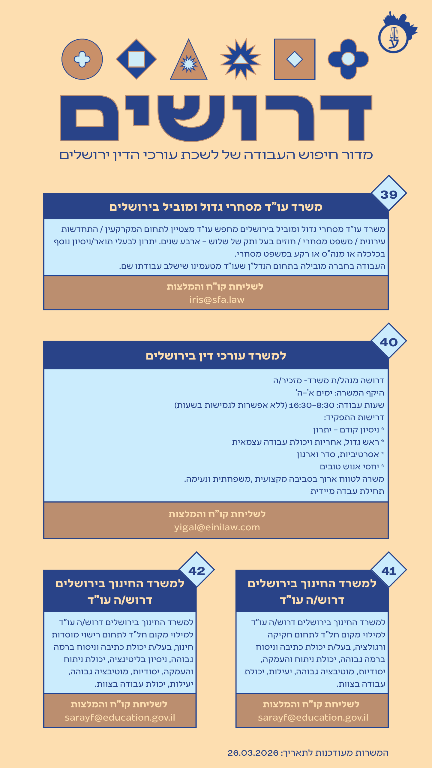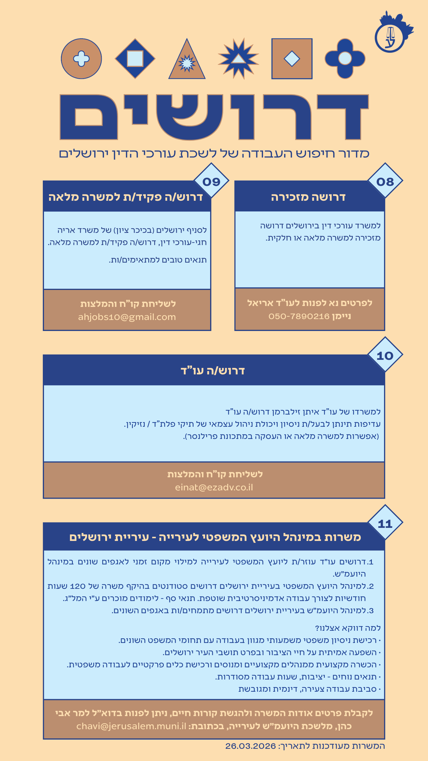 לקבלת פרטים אודות המשרה ולהגשת קורות חיים – ניתן לפנות בדוא"ל של גב' איקה בלחש- ממונה על פרויקטים ומינהל במינהל היועמ"ש לעירייה : blika@jerusalem.muni.il