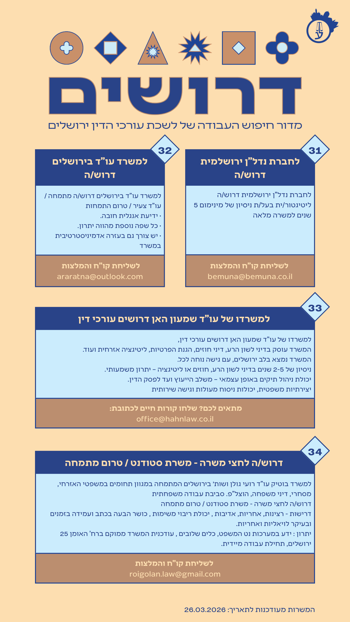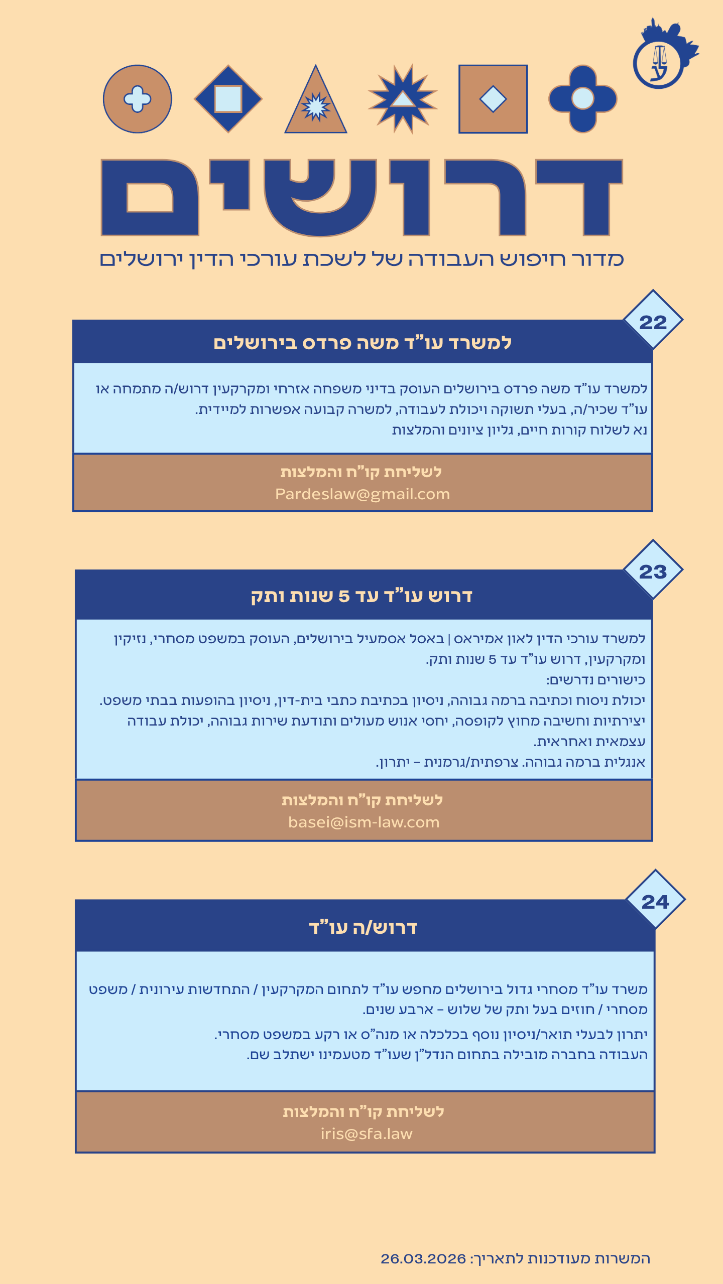למשרד עורכי דין בירושלים דרוש עו"ד למשרה מלאה בתחומים הבאים: